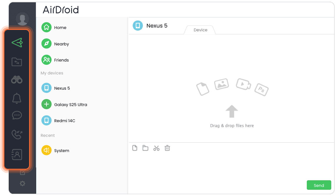 AirDroid Personal te permite tomar el control total de tu teléfono o tableta Android desde tu ordenador, sin importar dónde te encuentres. Ya sea que necesites responder mensajes, abrir aplicaciones o ayudar a un familiar a solucionar un problema con su dispositivo, todo funciona de manera fluida e intuitiva, como si tuvieras el teléfono en la mano.