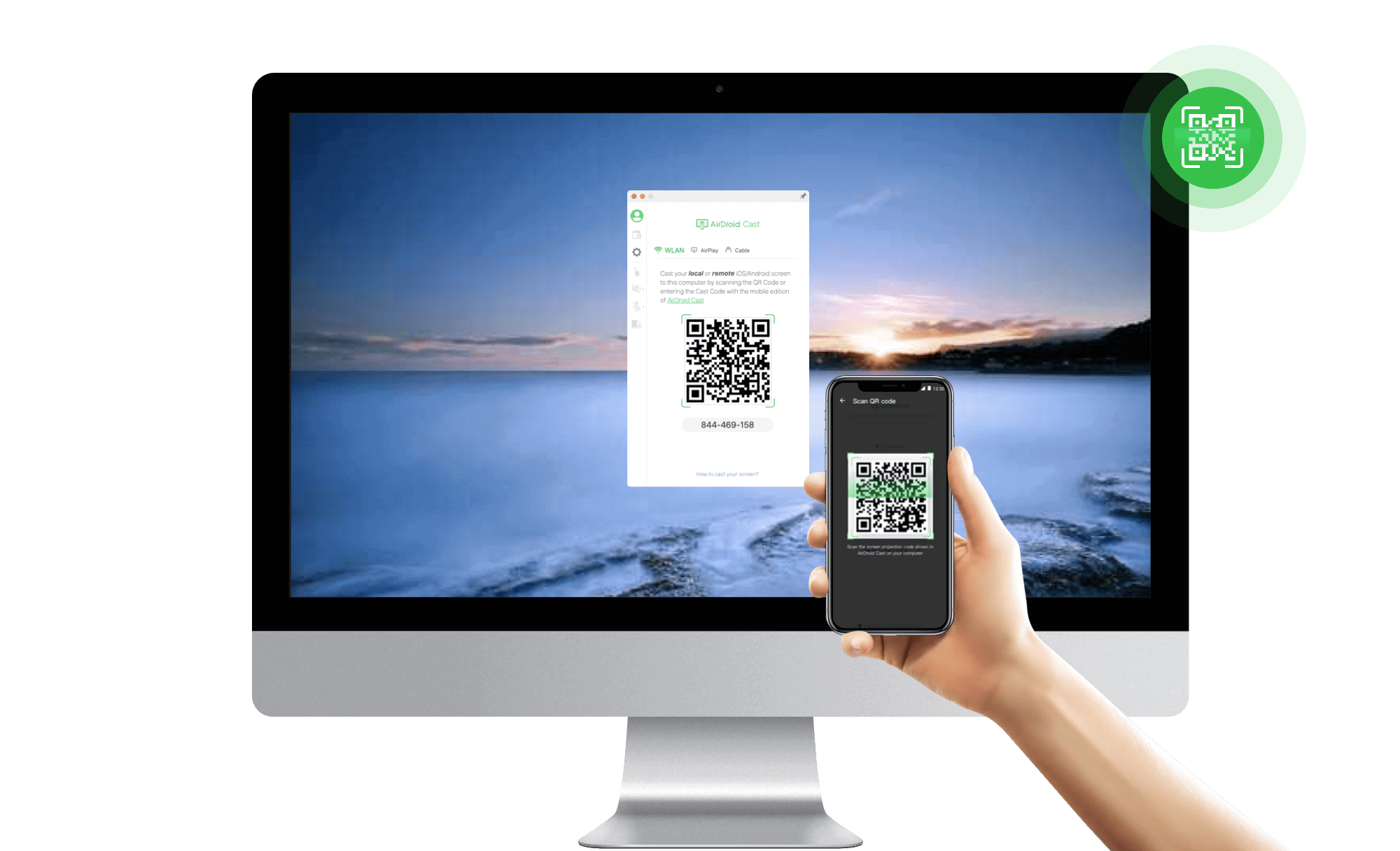 Trasmetti in remoto lo schermo del tuo telefono (Android/iOS) o PC (Windows/Mac) al cliente AirDroid Cast sul PC, oppure visita webcast.airdroid.com sul browser per iniziare a ricevere lo screencast
