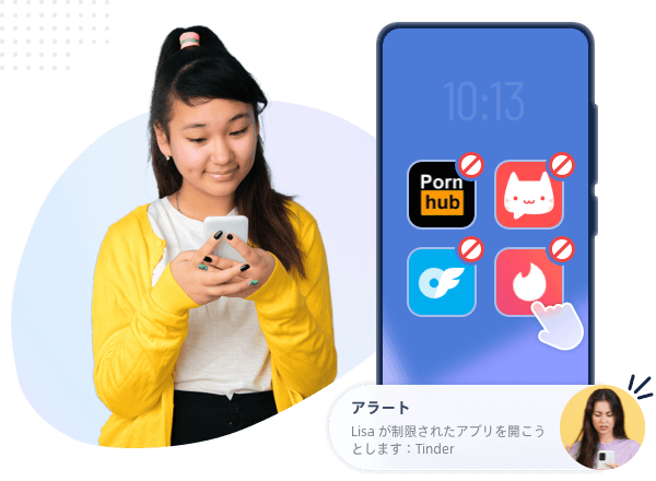 - 子供のスマートフォンのチャット、閲覧、投稿、検索に露骨な表現を含むキーワードが表示された場合にアラートを受信します。