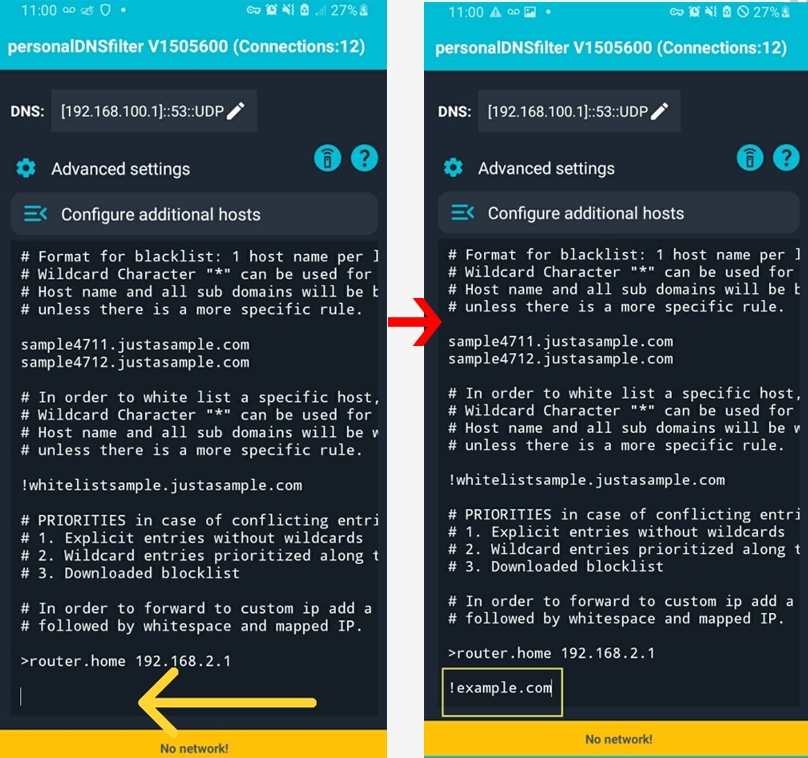 personalDNSfilter sets up a VPN tunnel on your device, intercepts all DNS lookups, and applies filter lists you’ve downloaded. The Configure additional hosts screen lets you override those filters: