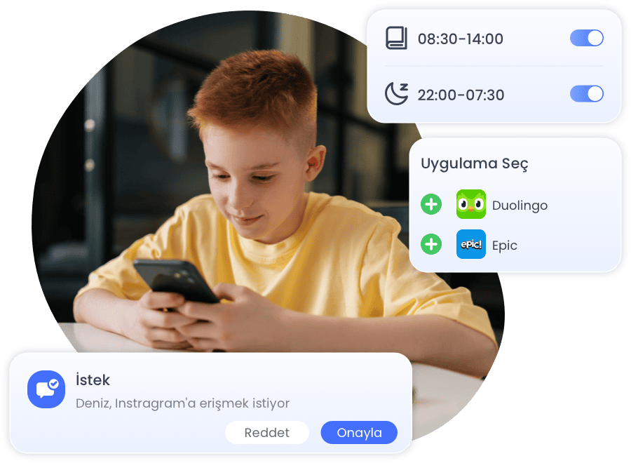 Kontrollü ve faydalı bir ekran süresi için Khan Academy, Duolingo, Quizlet, Matematik veya Okuma uygulamaları gibi eğitici ve okulla ilgili seçenekleri içeren kişiselleştirilmiş bir izin verilen uygulamalar listesiyle çocuğunuzun uygulama erişimini özelleştirin.