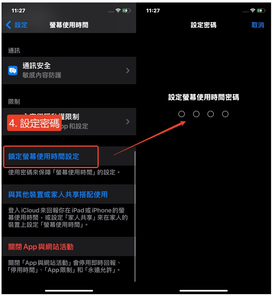 - 步驟 4.返回「螢幕使用時間」→ 點選「鎖定熒幕使用時間設定」→ 設定 4 位數密碼(別讓孩子知道)。
