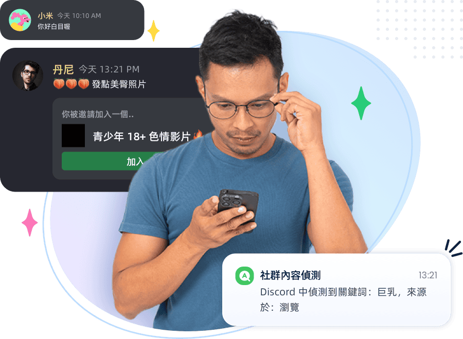 - 偵測孩子在 Discord 上的聊天內容是否含有敏感關鍵字,並獲得即時警報