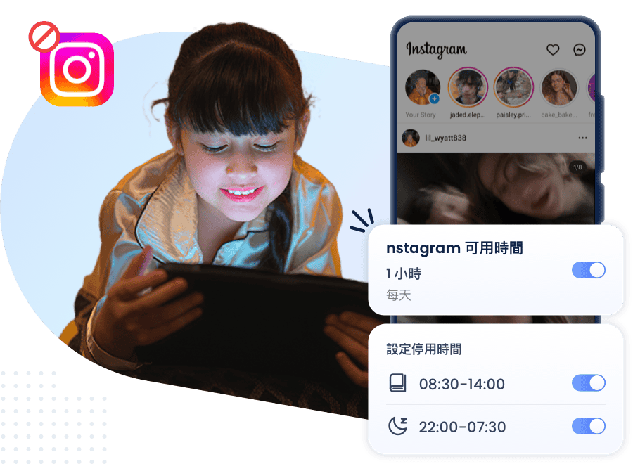 - 安排停用時間:設定特定時間如在上課時或睡眠時間您的孩子只能在裝置上使用白名單上的 app,封鎖 IG 等令人上癮的 app。