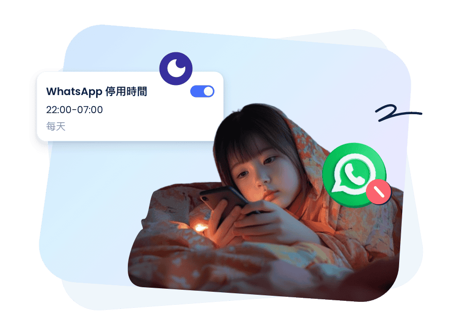 設定不可使用 WhatsApp 的時間或限制每日可使用應用程式的時間。如果孩子年紀小於 13 歲,您也可以封鎖 WhatsApp,以避免不必要的接觸。