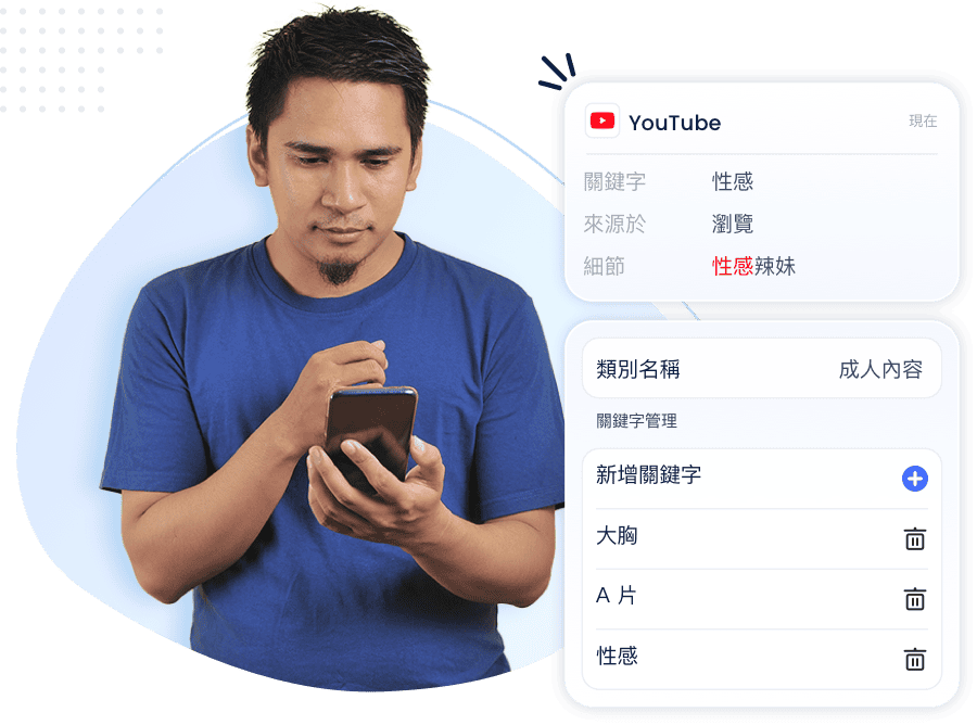 - 自訂用於偵測 YouTube 內容的敏感關鍵字如: 色情、網路霸凌等